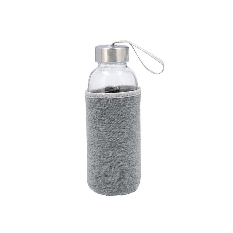 Cos de vidre. Funda grisa de neoprè. Tap de rosca.