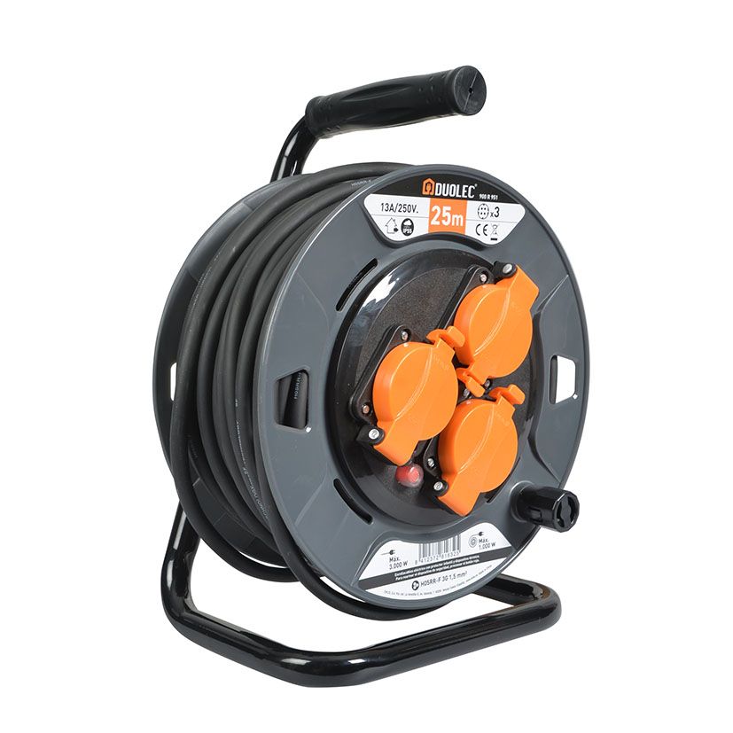 3 preses amb tapa, T/T lateral. Cable H05RR-F 3G1,5. Interruptor de protecció tèrmica. Potència màxima admissible cable desenrotllat 3.000 W. Cable enrotllat 1.000 W. Tensió 13A/230V. Rodet de plàstic. Suport metàl·lic.
