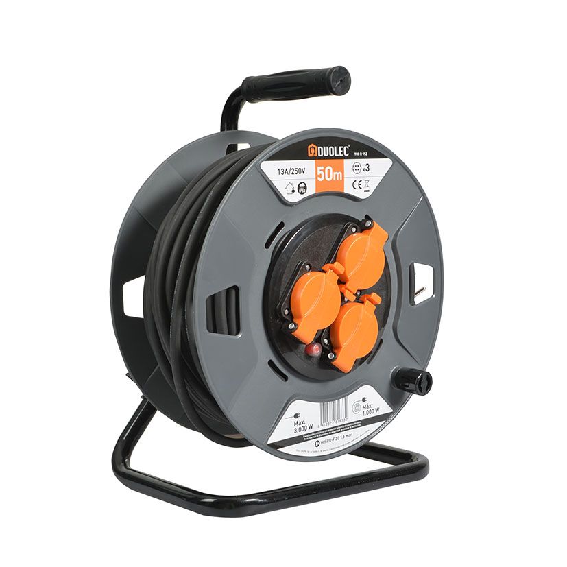 3 preses amb tapa, T/T lateral. Cable H05RR-F 3G1,5. Interruptor de protecció tèrmica. Potència màxima admissible cable desenrotllat 3.000 W. Cable enrotllat 1.000 W. Tensió 13A/230V. Rodet de plàstic. Suport metàl·lic.